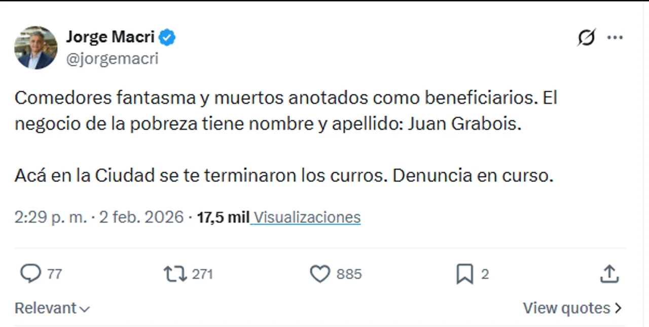 El jefe de Gobierno porteño, Jorge Macri, denunció este lunes en la Justicia al diputado de Unión por la Patria Juan Grabois por la supuesta utilización de "comedores fantasma y muertos anotados como beneficiarios" que según él se habría pergeñado como metodología de captación de fondos públicos para organizaciones sociales.