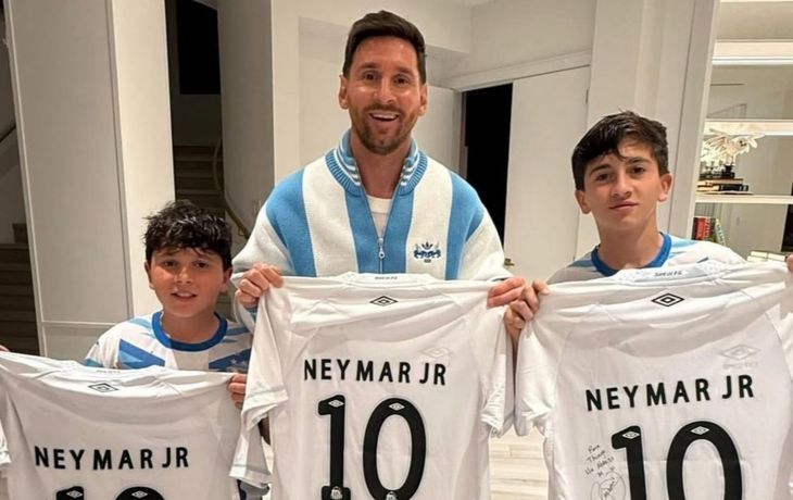 El brasilero le obsequió camisetas del Santos a Lionel Messi, Thiago y Mateo con dedicatorias especiales y un mensaje que resaltó el legado del número 10.