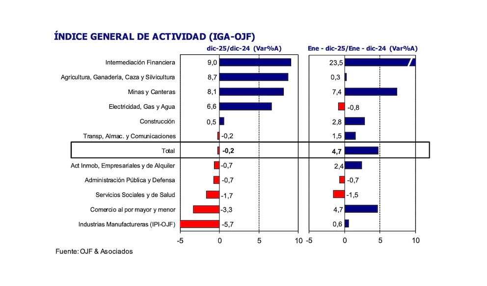 Otras mediciones, como el IGA-OJF de Orlando J. Ferreres & Asociados, mostraron matices en el desempeño de la economía argentina en diciembre de 2025. Ferreres reportó que el nivel general de actividad marcó una contracción de 0,2% interanual en diciembre, acumulando una suba de 4,7% para todo el año. La medición desestacionalizada arrojó una caída de 0,6% respecto al mes anterior. Según la consultora, diciembre sumó una nueva baja a los descensos del cuarto trimestre, cerrando un 2025 de mayor a menor, con una baja de 0,5% al comparar el cuarto trimestre con el tercero.