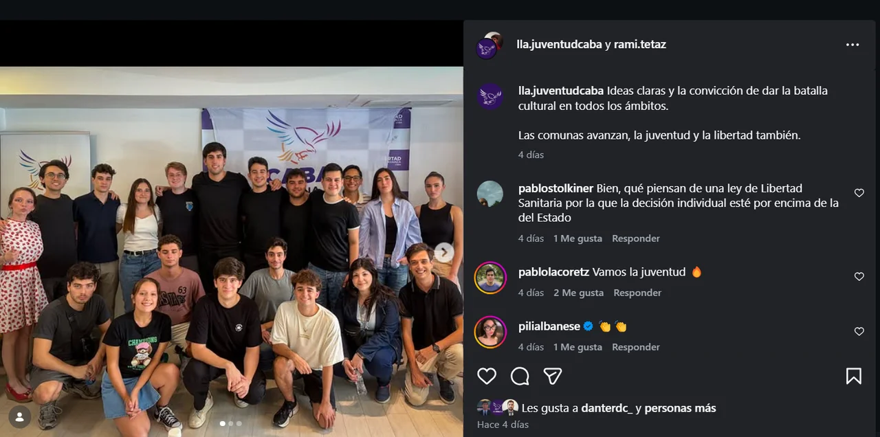 La agrupación juvenil de Milei de la ciudad de Buenos Aires, LLA Juventud CABA, que tiene como uno de sus referentes a Dante Di Carlo, se encuentra sumergida en esos ejes, caminando el territorio y dialogando con la militancia. Ante la consulta de Agencia Noticias Argentinas, fuentes del espacio recalcaron que "el laburo que estamos haciendo en las comunas ya está dinamizado y hoy está todo funcionando excelente".