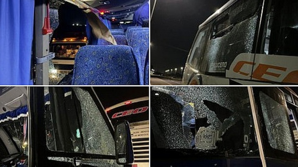 "Llegando a la localidad de Los Andes, los escotó Carabineros. Los ataques, fueron tres en diferentes momentos, se dieron saliendo de Santiago hasta el peaje Chacabuco (hasta allí no los escoltó nadie). Así quedó otro micro y unas de los escombros que les arrojaron (una locura)", informó el periodista mendocino Tato Aguilera.