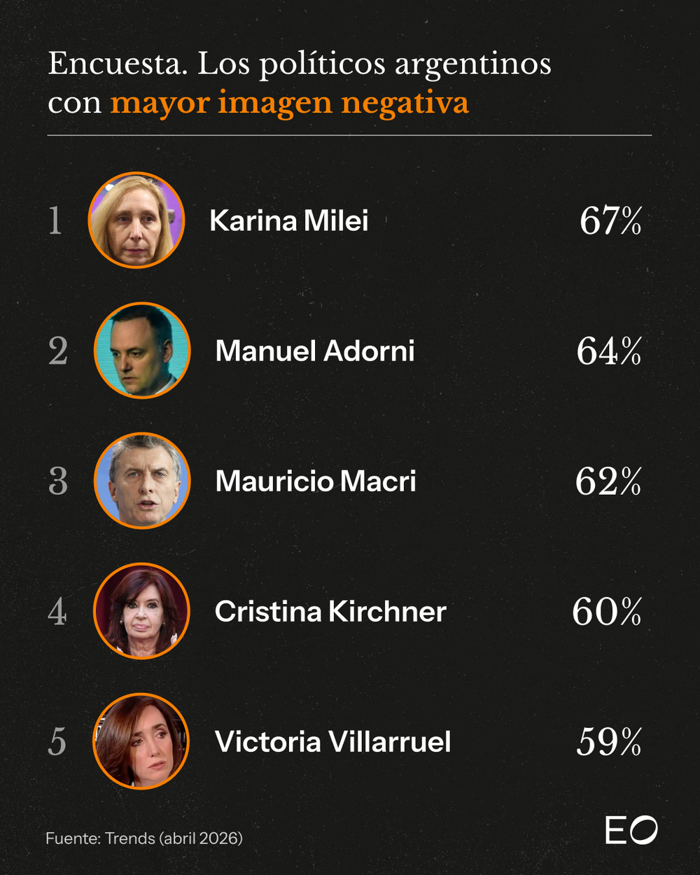 El relevamiento de la consultora Trends, realizado en abril de este 2026, lo deja claro. El sondeo se hizo en base a 7 políticos argentinos puntuales y se midió su imagen positiva y negativa. Los analizados fueron Javier Milei, Karina Milei, Manuel Adorni, Victoria Villarruel, Mauricio Macri, Axel Kicillof y Cristina Kirchner. Si bien el jefe de Estado salió bien parado de la medición, su círculo cercano no: Karina y Adorni fueron los de peor imagen positiva y los de mayor imagen negativa.