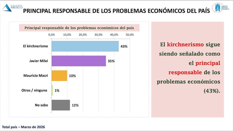 El último cuadro de Federico Aurelio: según los consultados, el principal responsable sigue siendo el kirchnerismo, 43%. Milei debe decir: "Por Dios, que no se caiga". Por eso todo el discurso oficial es plantear el temor a un regreso del kirchnerismo. Ese discurso oficial lo paga "Toto" Caputo en el Ministerio de Economía cuando los inversores dicen: "Si ustedes nos dicen que puede volver el kirchnerismo, no pongo un dólar hasta ver qué pasa en 2027?. Pero ya el 35% le empieza a echar la culpa a Milei. Y esto es relevante. A medida que pasa el tiempo, el gobierno se va haciendo responsable de lo que está pasando, de la percepción de bienestar o de malestar que tiene la gente, y ya no puede hablar tanto de herencia recibida.