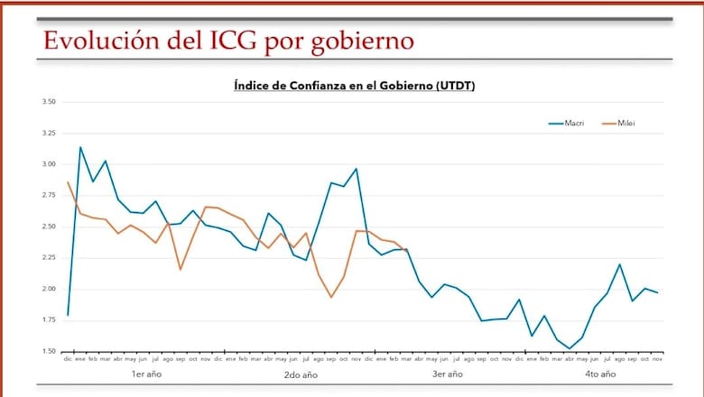 Otro cuadro, que no es ya de Aurelio, muestra el Índice de Confianza en el Gobierno (ICG) durante todo el período de Macri. ¿Por qué es importante? Porque se parecen mucho, sobre todo en el tramo final. Empieza a haber una caída y la gran incógnita, aquello que seguramente tiene preocupado a Milei, es si esta curva naranja va a seguir imitando, parcialmente, la curva celeste de Macri.