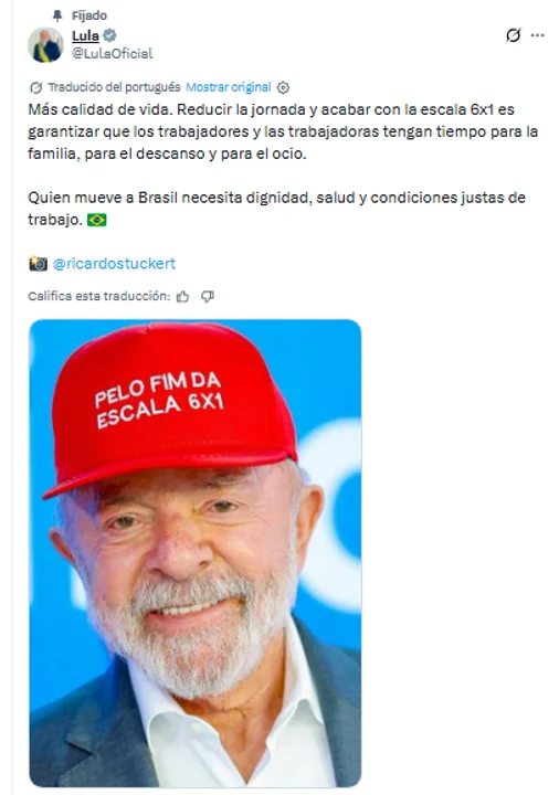 "Reducir la jornada y acabar con la escala 6x1 es garantizar que los trabajadores y las trabajadoras tengan tiempo para la familia, para el descanso y para el ocio", expresa Lula en su mensaje en su cuenta de X, acompañado de una imagen donde se lo ve con una gorra que lleva el lema "Por el fin de la escala 6x1".