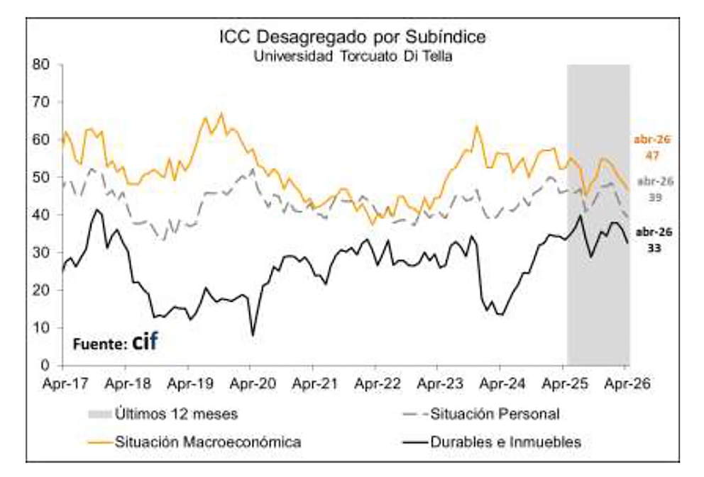 El componente de situación macroeconómica bajó 4,30% en abril y quedó 10,69% por debajo del mismo mes de 2025. En paralelo, la situación personal descendió 3,96% mensual y acumuló una caída interanual de 15%, siendo uno de los segmentos más golpeados del índice.
