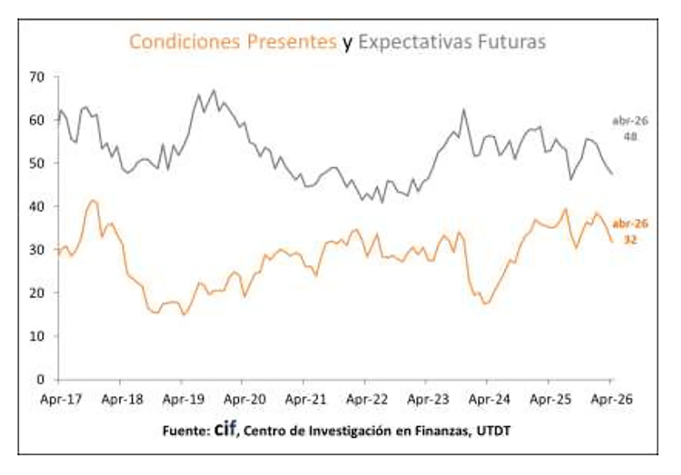 El gráfico de líneas compara las condiciones presentes y las expectativas futuras desde abril de 2017 hasta abril de 2026, mostrando la dinámica de ambas variables en el tiempo.