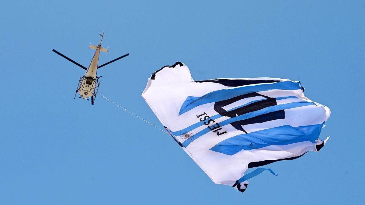 Una enorme camiseta celeste y blanca del astro del fútbol mundial, Lionel Messi, catalogada como "la más grande del mundo", apareció este martes al mediodía elevada por un helicóptero y flameando en el cielo de la costa de Rosario, en donde "La Pulga" nació e hizo sus primeras gambetas, para alentar a la selección en la previa de la semifinal contra Croacia.