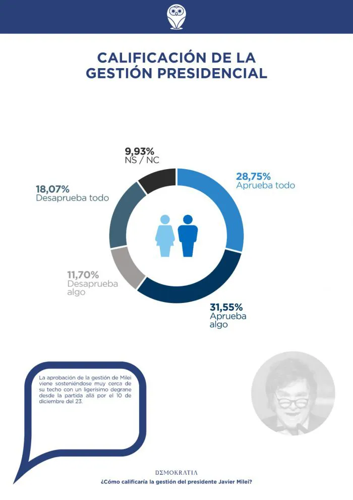 Desde la consultora, al analizar estos números, consideraron que "desde su asunción a fuerza de estruendosas declaraciones, inéditas jugadas e indicadores macro que empiezan a mostrar resultados, Milei ha ido paulatinamente refinanciando el crédito de su contrato electoral con la ciudadanía".
