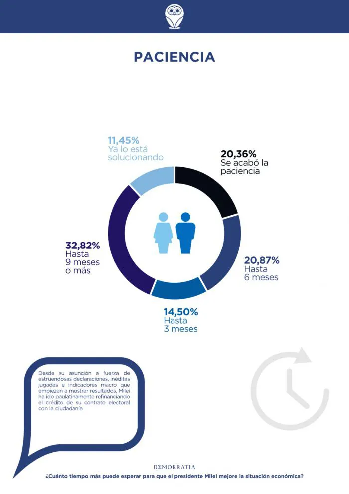 También se le preguntó a los encuestados "cuánto tiempo más puede esperar para que el presidente Milei mejore la situación económica", las opiniones están divididas, aunque sólo un 20% respondió que "se acabó la paciencia".