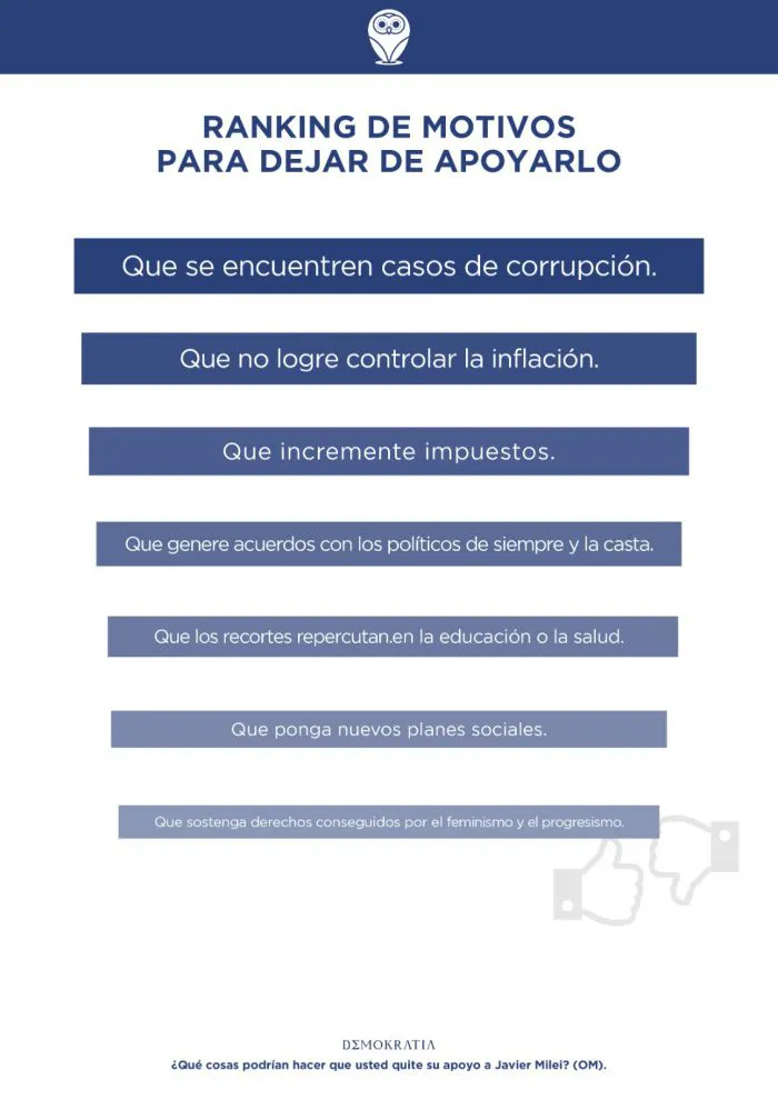 También se consultó qué cosas podrían hacer que le quite el apoyo a Milei, el ranking de motivos es liderado por el "que se encuentren casos de corrupción", seguido por el "que no controle la inflación" y en tercer lugar que "incremente impuestos".