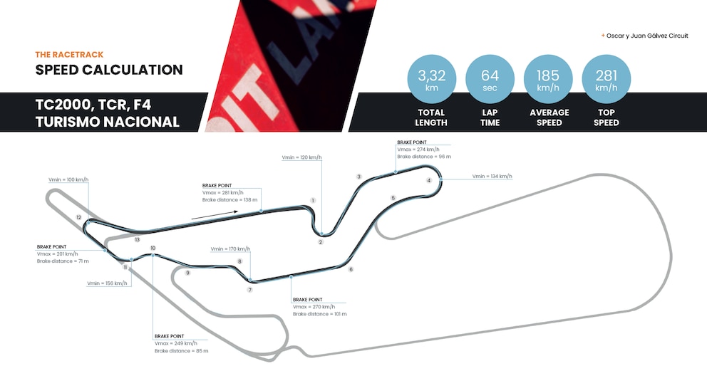 En tanto que para el resto de las categorías nacionales y zonales quedará una variante con 3.322 metros. Tendrá 13 curvas con 5 a la izquierda y 8 a la derecha. La velocidad final será 281 km/h, un promedio de 184 km/h y un tiempo de vuelta de 64 segundos.