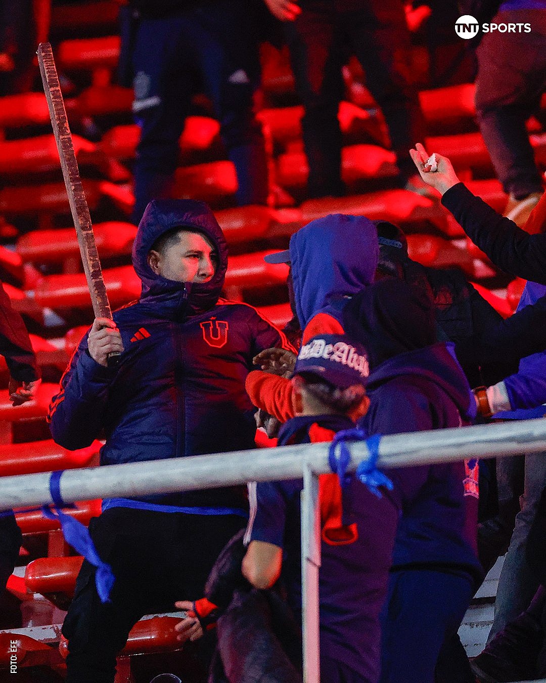 Los fanáticos del conjunto chileno también incendiaron butacas de la tribuna Pavoni y, durante el entretiempo, fueron desalojados por la policía ante el pedido de los jugadores de la "U" para que se detengan las agresiones.