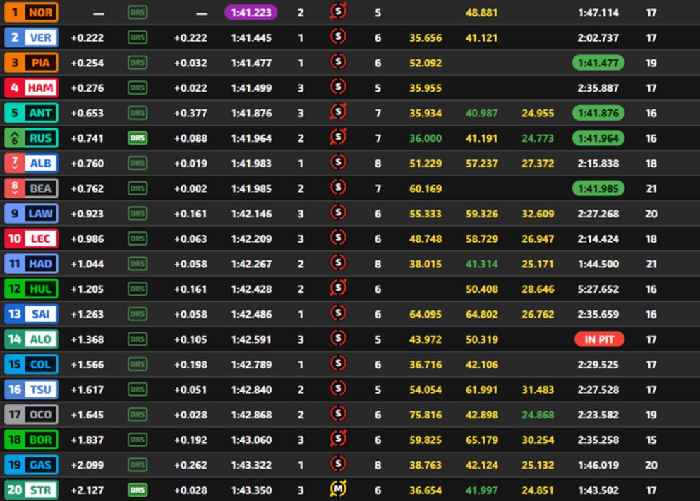 El más veloz hasta acá es Lewis Hamilton con un giro de 1:41.821 para aparecer por delante de Oscar Piastri (1:41.839) y Charles Leclerc (1:41.982).
