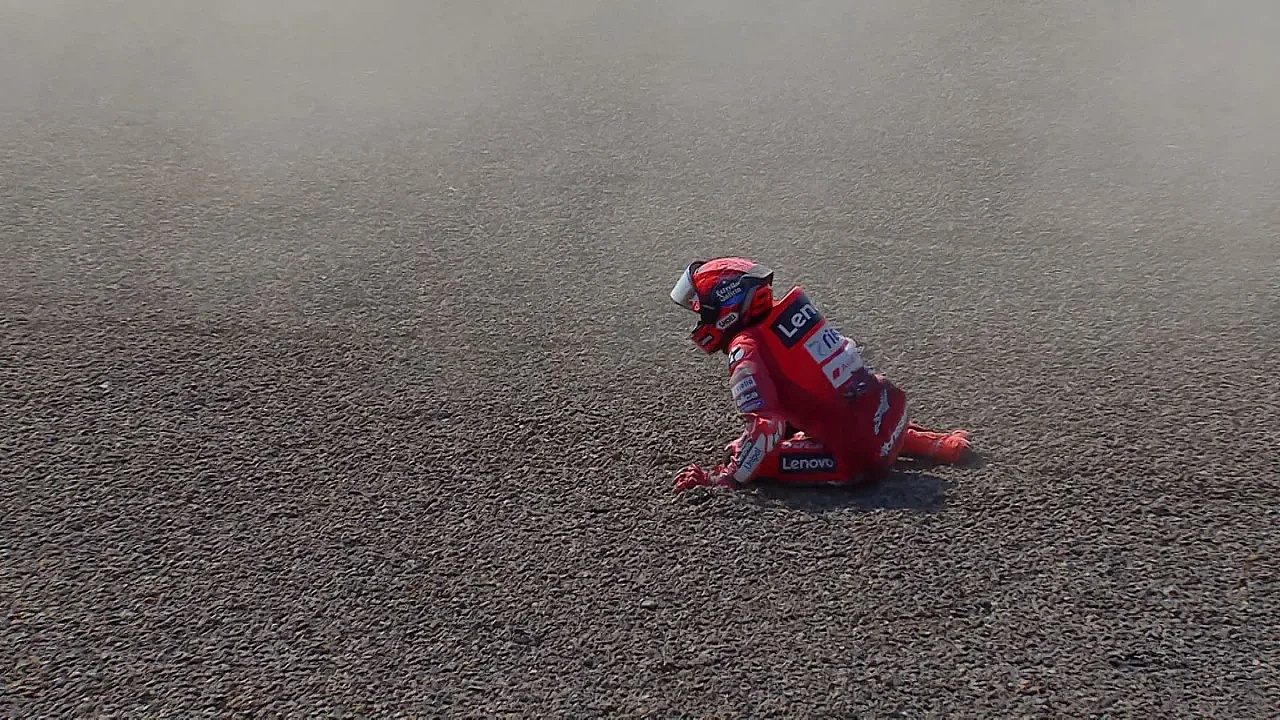 El accidente se produjo en la curva 7, cuando Bezzecchi, autor de la pole, calculó mal la frenada y golpeó la rueda trasera de Márquez, lo que provocó que ambos salieran despedidos hacia la grava.
