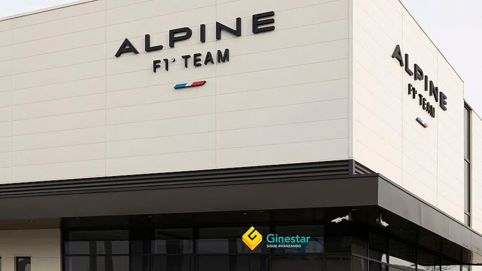 La moderna fachada de las instalaciones de Alpine F1 Team en Viry-Chatillon, Francia, exhibe su logotipo y un emblema tricolor, con el logo de Ginestar visible en la entrada