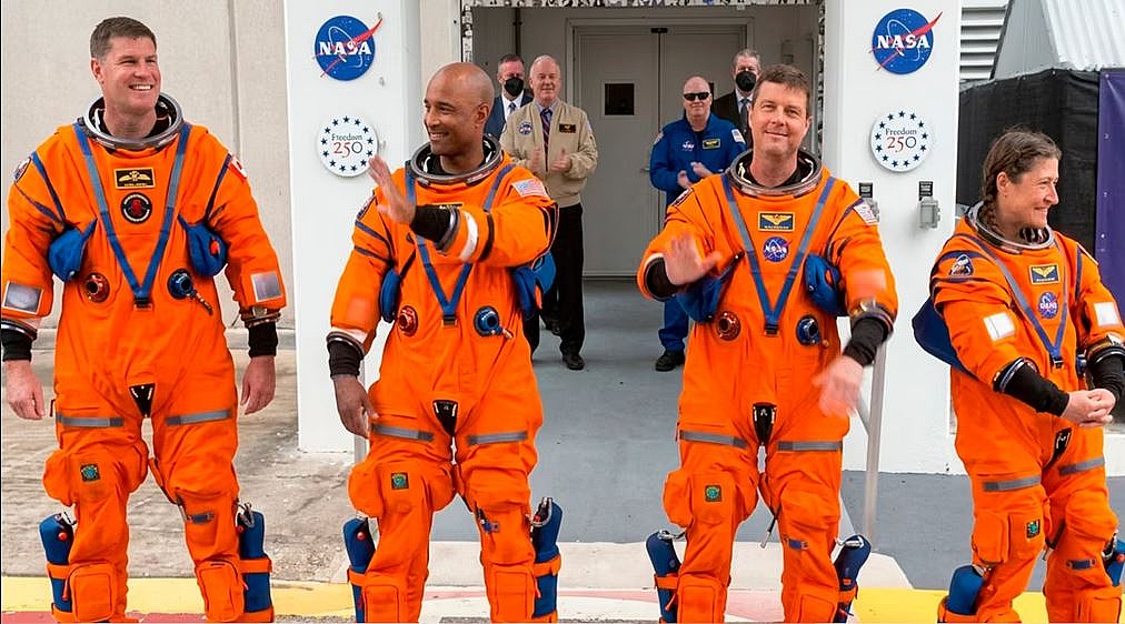 Reid Wiseman, Victor Glover, Christina Koch y Jeremy Hansen emprendieron el camino hacia el cohete que los llevará a la órbita lunar.