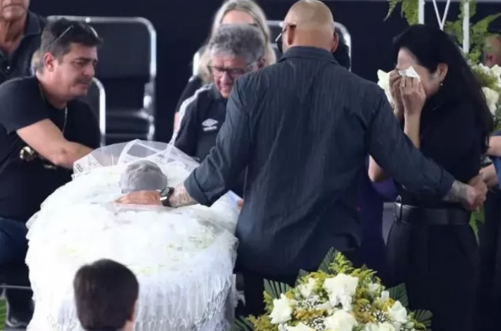 El féretro de Pelé llegó por la mañana desde el hospital Albert Einstein de San Pablo, a 70 kilómetros de distancia, adonde falleció luego de un mes de internación, y fue llevado hasta el centro del campo de juego por su hijo Edinho, exarquero que tuvo problemas judiciales por drogas y que es el entrenador del Londrina, del ascenso, y por el futbolista exmundialista Zé Roberto, exSantos exPalmeiras y Bayern Munich.
