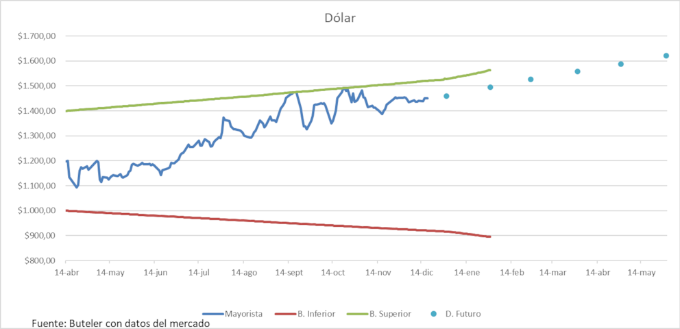El analista financiero Christian Buteler observó que con el nuevo régimen cambiario atado a la inflación, los contratos de dólar a futuro comienzan a quedar totalmente alineados con las previsiones de ascenso del dólar. Esta condición no se estaba dando en el último mes, pues los contratos de dólar futuro con vencimientos a partir de 2026 estaban desbordando el techo de las bandas que continuaban creciendo a razón del 1% mensual y rezagadas contra la inflación.