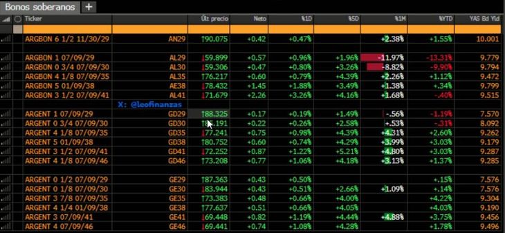 En la bolsa de Nueva York, los títulos en dólares subieron hasta más de 3%, en el caso de los Bonares emitidos bajo legislación argentina, y hasta más de 1% en el caso de los Globales (con jurisdicción neoyorkina). Los mayores avances los registraron el Bonar 2041 (+3,3%); el Bonar 2038 (+1,9%); y el Gobal 2041 (+1,2%).