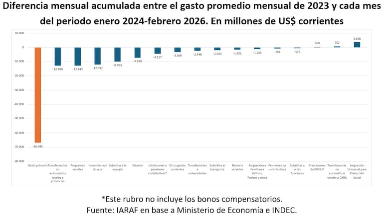 Según el Iaraf, la reducción del gasto en los últimos 26 meses superó los 10 puntos del PBI en poco más de dos años, en uno de los mayores ajustes fiscales de la historia reciente. Más del 90% de ese recorte se destinó a revertir el déficit fiscal y sostener el superávit, más que a la baja de impuestos.