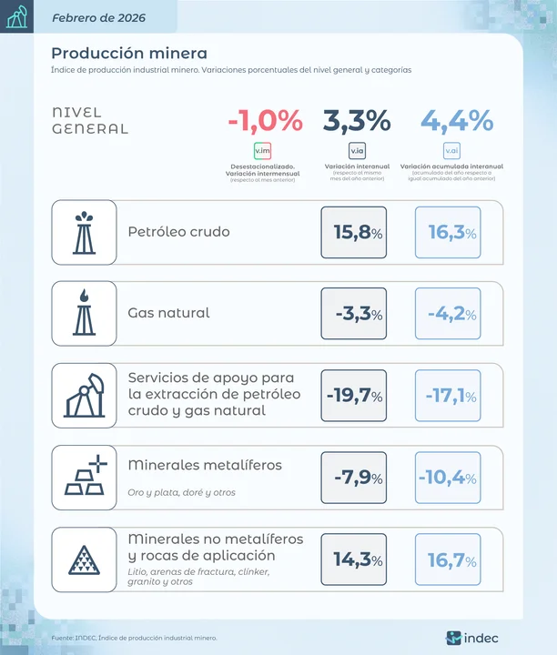 "En febrero de 2026, el índice de producción industrial minero (IPI minero) muestra una suba de 3,3% respecto a igual mes de 2025", por lo que "el acumulado enero-febrero de 2026 presenta un aumento de 4,4% respecto a igual acumulado del año anterior".