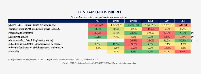 Comparación de variables sociales y económicas en los terceros años de gobierno: en 2026 aparece una mejora incipiente en salarios, pero aún en niveles bajos y con deterioro en otros indicadores como morosidad y confianza.