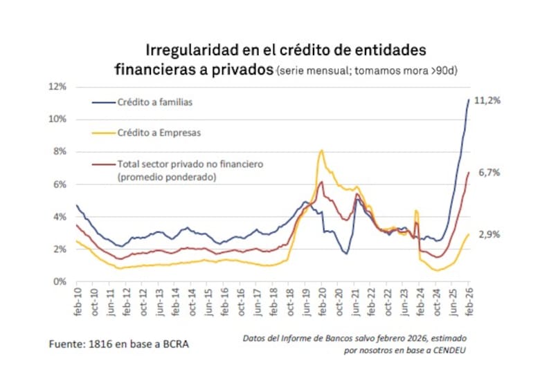 Sin embargo, ese equilibrio financiero todavía no se traduce plenamente en la economía real. El crédito sigue mostrando fragilidad. Según la consultora 1816, la morosidad de los préstamos a familias alcanzó el 11,2% en febrero -el nivel más alto desde 2004-, mientras que las tasas de los préstamos personales se mantienen en torno al 70% nominal anual, muy por encima del costo de fondeo de los bancos.
