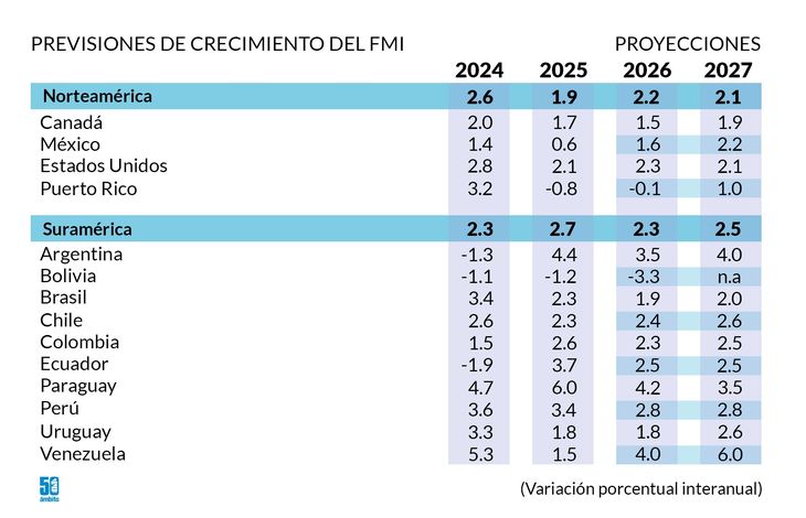 La economía argentina también se ubica entre las que registrarían la mayor tasa de inflación en 2026, según el FMI. Se proyecta un aumento de los precios de 25%, el tercer registro más alto del sur de América después de Venezuela -220%- y Bolivia - 26,1%-.
