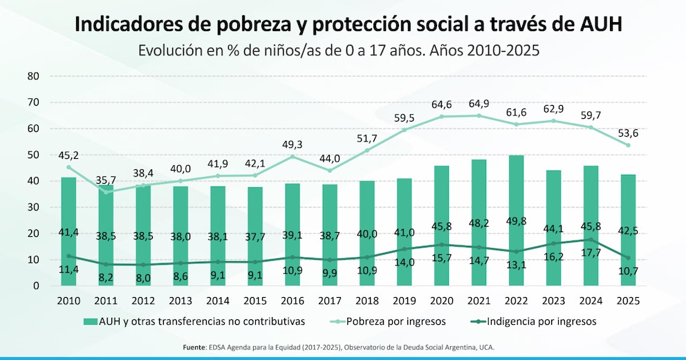 Por otra parte, el reporte detalla que la cobertura de transferencias monetarias, como la Asignación Universal por Hijo (AUH), alcanzó al 42,5% de los niños, lo que conlleva una merma de 3,3 puntos porcentuales en relación a 2024.