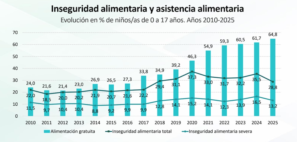 Por otra parte, el informe señaló que el 28,8% de los niños y adolescentes experimentó inseguridad alimentaria en 2025, con un 13,2% en su forma más severa. Si bien estos valores implican un avance respecto de 2024, no logran retornar a los niveles previos a 2017.