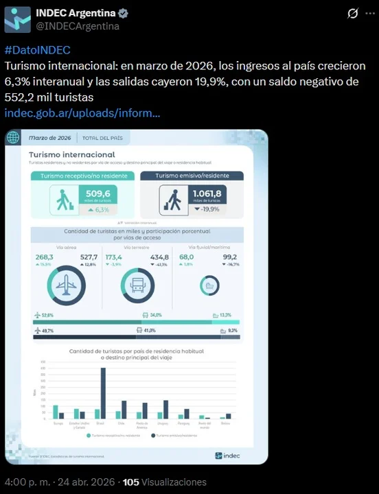 Según la información oficial del INDEC, en marzo (2026), el turismo internacional creció, logrando un incremento del 6,3% de manera interanual. A su vez, cayeron un 19,9% las salidas, registrando un saldo negativo de 552,2 mil turistas.