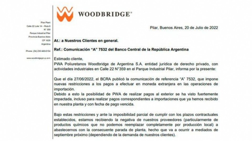 La compañía, que fabrica apoyacabezas, apoyabrazos y espumas de poliuretano utilizadas en el interior de los automóviles, es proveedora de la mayoría de las terminales automotrices que producen en la Argentina desde su planta ubicada en el Parque Industrial Pilar. En la carta que envió hoy a sus clientes, a la que accedió Infobae, puntualizó que la comunicación A7532 del Banco Central, que a fines de junio dispuso más restricciones para el pago de importaciones, limitó al máximo su posibilidad de cumplir con sus compromisos con el exterior, “incluso para realizar pagos correspondientes a importaciones que ya hemos recibido en nuestra planta y con fecha de pago vencida.”