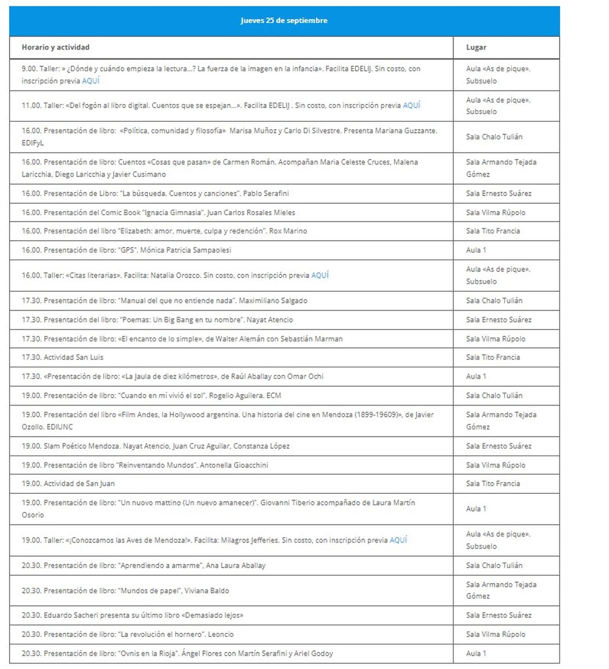 La feria también contará con la presencia de figuras en los distintos departamentos: en Santa Rosa estarán Narda Lépez y Fabián Vena. En San Martín, Rocambole, Chango Spasiuk y Pablo Bernasconi. En San Carlos, Iván Noble. En San Rafael, Eduardo Sacheri, Doctor Chinasky y REP; y en General Alvear, Fabián Vena y Nito Mestre.