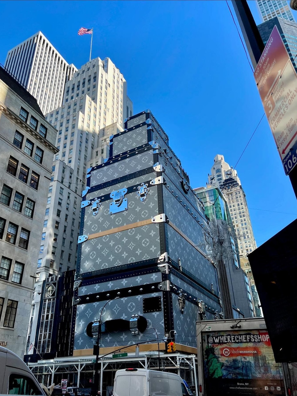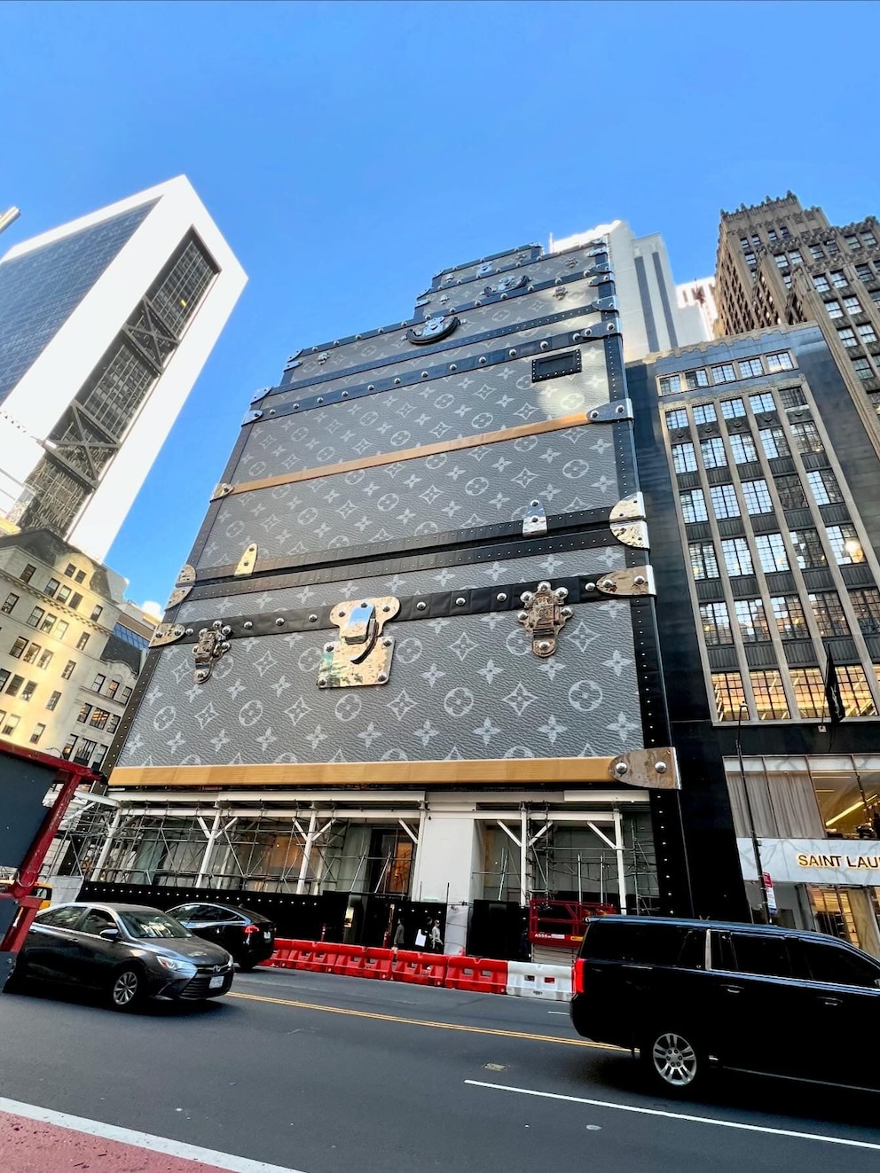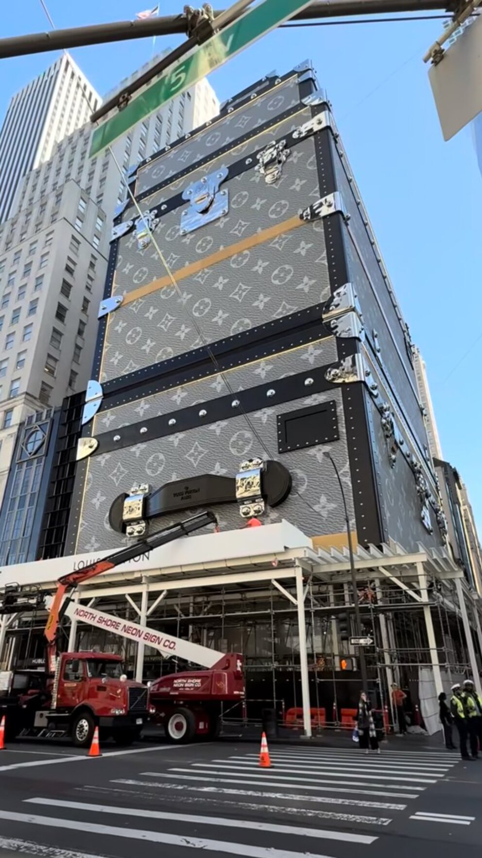 La icónica marca de moda transforma la apariencia de su edificio en Fifth Avenue, creando una instalación que evoca sus clásicos maletines de viaje mientras avanza un ambicioso proyecto de remodelación
