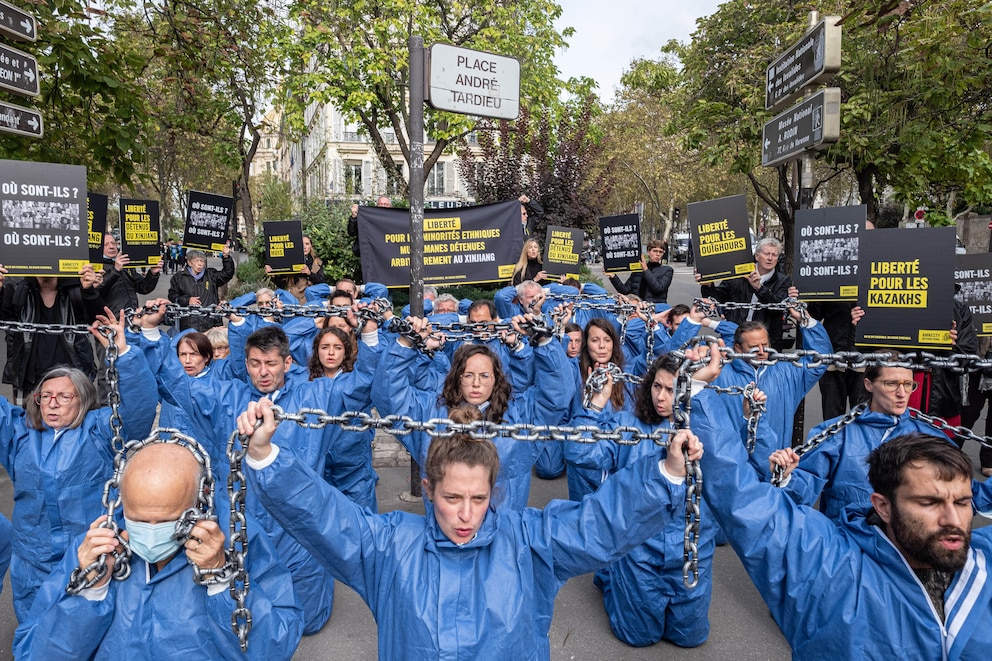 Personas participan en una manifestación organizada por Amnistía Internacional en 2021 para denunciar las presuntas violaciones de los derechos humanos en Xinjiang contra la minoría uigur en China