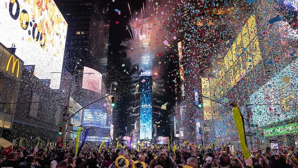 Vista aérea de Times Square colmado de público durante la medianoche de Año Nuevo, con confeti cayendo sobre la multitud y las pantallas iluminando la escena.