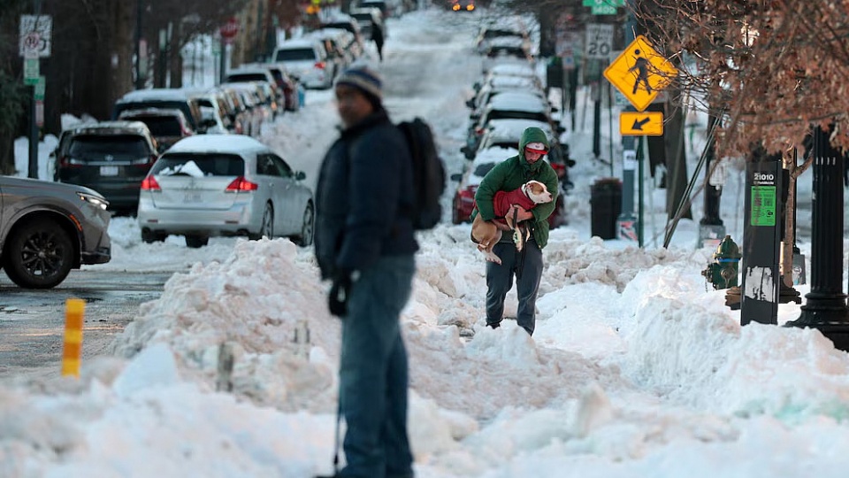 La nieve cubre la calle R NW, dos días después de que una tormenta invernal azotara una gran franja de Estados Unidos, en Washington
