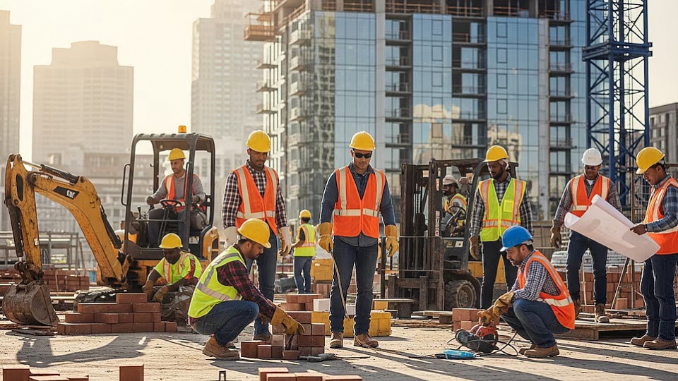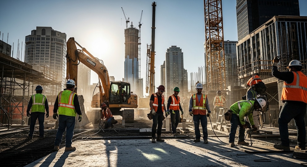 Trabajadores de la construcción en Estados Unidos realizan sus labores diarias en un concurrido sitio de obra, utilizando maquinaria pesada y equipos de seguridad para edificar infraestructuras modernas