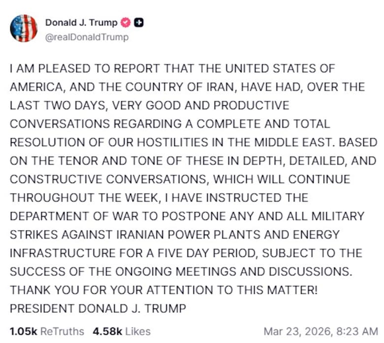 Trump hizo el anuncio en su plataforma Truth Social, apenas unas horas antes de que terminara el plazo previsto para más tarde ese mismo día. Escribiendo en mayúsculas, el republicano dijo que las conversaciones entre Estados Unidos e Irán podrían llevar a "una resolución completa y total" de la guerra. Las negociaciones continuarán "a lo largo de la semana", afirmó Trump.