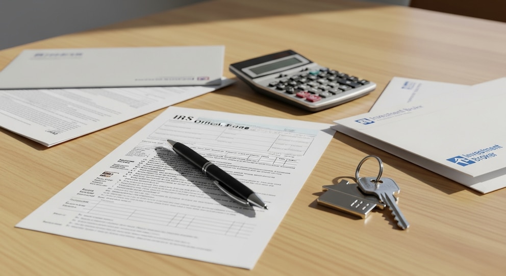 Documentos fiscales del IRS, una calculadora, un bolígrafo y llaves de casa están dispuestos sobre una mesa de madera clara, simbolizando la compleja preparación de impuestos y las implicaciones financieras de la venta de viviendas