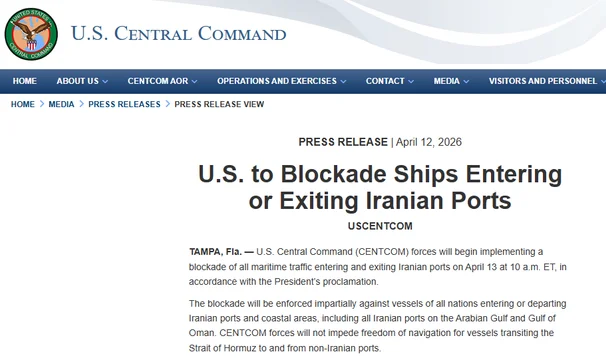 El Comando Central de Estados Unidos (USCENTCOM) anunció un bloqueo al tráfico marítimo en los puertos iraníes que comenzará a partir de este lunes 13.