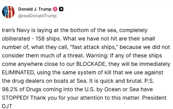 A través de un posteo en la red social X, añadió: "Advertencia: Si alguno de estos buques se acerca a nuestro BLOQUEO, será ELIMINADO inmediatamente, utilizando el mismo sistema de eliminación que empleamos contra los narcotraficantes en barcos en alta mar. Es rápido y brutal".