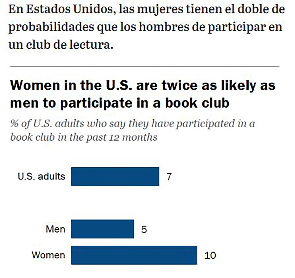 Un gráfico de barras revela que el 10% de las mujeres en Estados Unidos ha participado en un club de lectura, duplicando el 5% de los hombres y superando el 7% del total de adultos en los últimos 12 meses