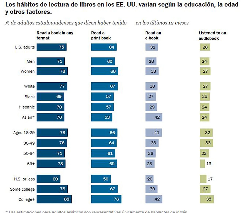 Los estadounidenses blancos son quienes más leen libros impresos, mientras que los de origen asiático encabezan el uso de libros electrónicos. Además, las mujeres presentan mayores niveles de lectura que los hombres en todos los formatos.