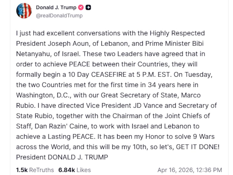 "Acabo de mantener excelentes conversaciones con el muy respetado presidente Joseph Aoun, del Líbano, y con el primer ministro Bibi Netanyahu, de Israel. Estos dos líderes han acordado que, para lograr la PAZ entre sus países, iniciarán formalmente un alto el fuego de 10 días a las 5:00 p.m. EST", escribió Trump en su red Truth Social.