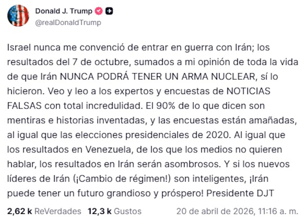 Arremetió además contra los medios -"el 90% de lo que dicen son mentiras e historias inventadas, y las encuestas están amañadas, igual que las elecciones presidenciales de 2020?-. La comparación con Venezuela, cuyo proceso político "los medios no gustan de mencionar", según Trump, refuerza la lectura de que el mandatario contempla activamente un escenario de colapso del régimen iraní como desenlace del conflicto.