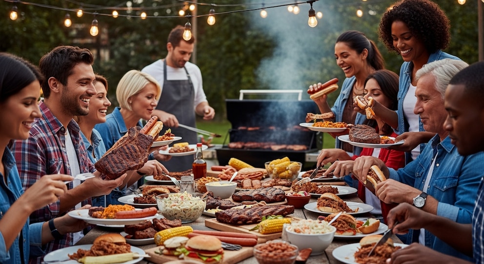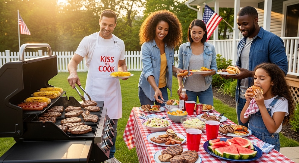 Una familia multicultural sonríe mientras prepara y comparte una barbacoa con hamburguesas, salchichas, maíz y sandía en el patio trasero de su casa en Estados Unidos bajo el sol