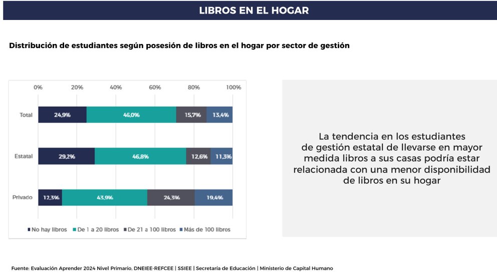 A nivel nacional, 1 de cada 4 estudiantes (24,9%) no tiene libros en su casa. Esa cifra es más alta en las escuelas estatales.