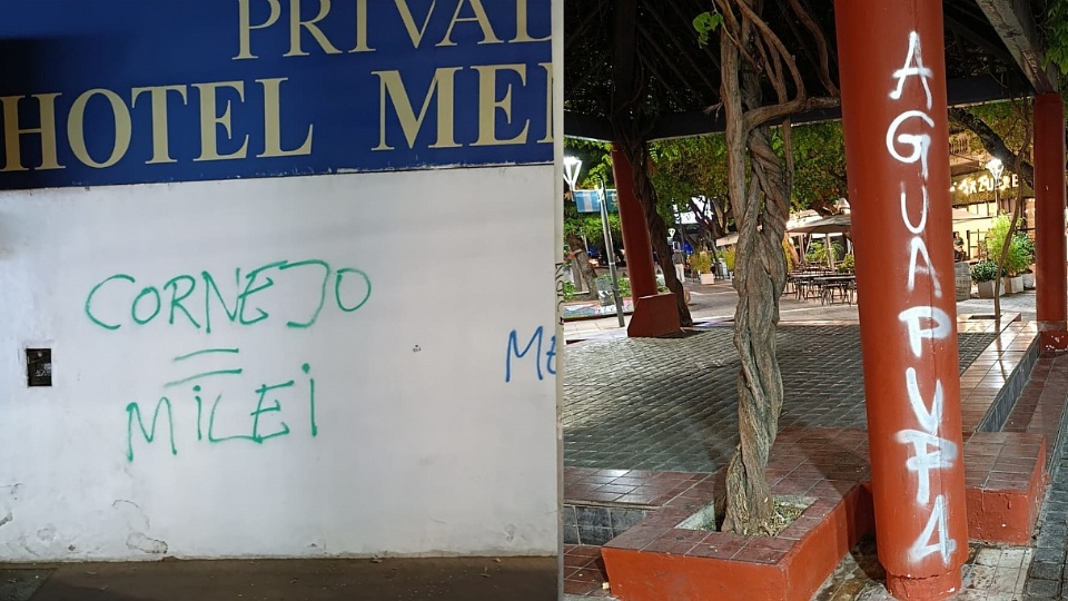 El ministerio de Seguridad de Mendoza tomará medidas judiciales contra un grupo de "antimineros" que causaron destrozos en el centro mendocino. En las imágenes se puede ver a la pérgola de la Peatonal con grafities y tambien en paredes atacando al Gobernador y al Presidente.